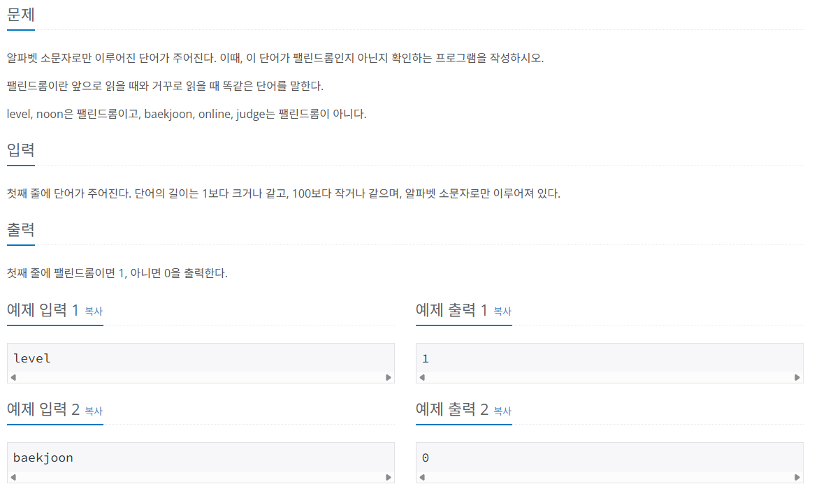 이렇게 되면 인풋을 받고 if로 word == word[::-1] 면 1, 아니면 0 으로 하면 될듯 하다.