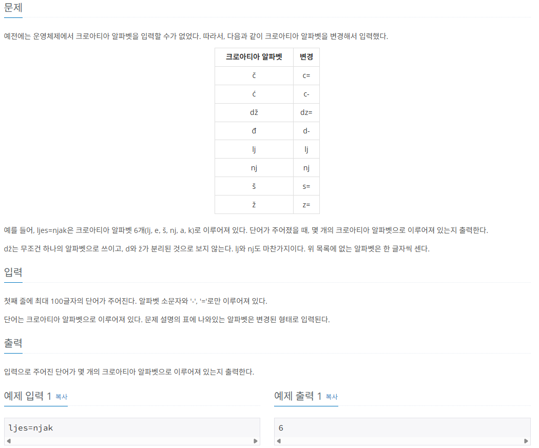 >> 아 문제를 잘못 이해했다. 예제를 보고 오해를 한 것 같다. lj 는 1로 카운트 해야하는데 lj의 크로아티아 알파벳을 보고 2로 카운팅 해야 하는 줄 알았다. 그러면 알파벳마다 다른 숫자가 들어가야하니 딕셔너리가 필요한 것이었는데, 크로아티아 알파벳과 일반 알파벳이 총 몇개인지 출력을 하는것이다. 문제의 지문을 잘 읽지 않아서 생긴 문제다.